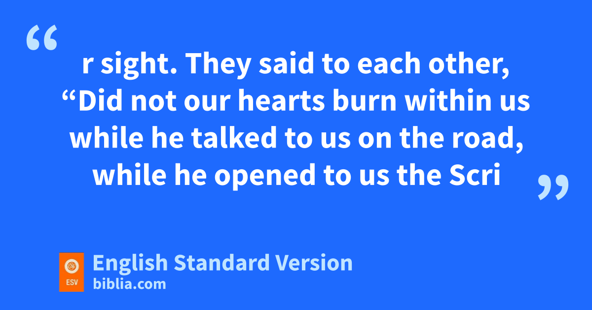 28 So they drew near to the village to which they were going. qHe acted as if he were going farther, 29 but they urged him strongly, saying, “Stay with us, for it is toward evening and rthe day is now far spent.” So he went in to stay with them. 30 When he was at table with them, he took the bread and sblessed and broke it and gave it to them. 31 tAnd their eyes were opened, and they recognized him. And uhe vanished from their sight. 32 They said to each other, v“Did not our hearts burn within us while he talked to us on the road, while he wopened to us the Scriptures?” 33 And they rose that same hour and returned to Jerusalem. And they xfound the eleven and ythose who were with them gathered together, 34 saying, “The Lord has risen indeed, and zhas appeared to Simon!” 35 Then they told what had happened on the road, and ahow he was known to them in bthe breaking of the bread.
