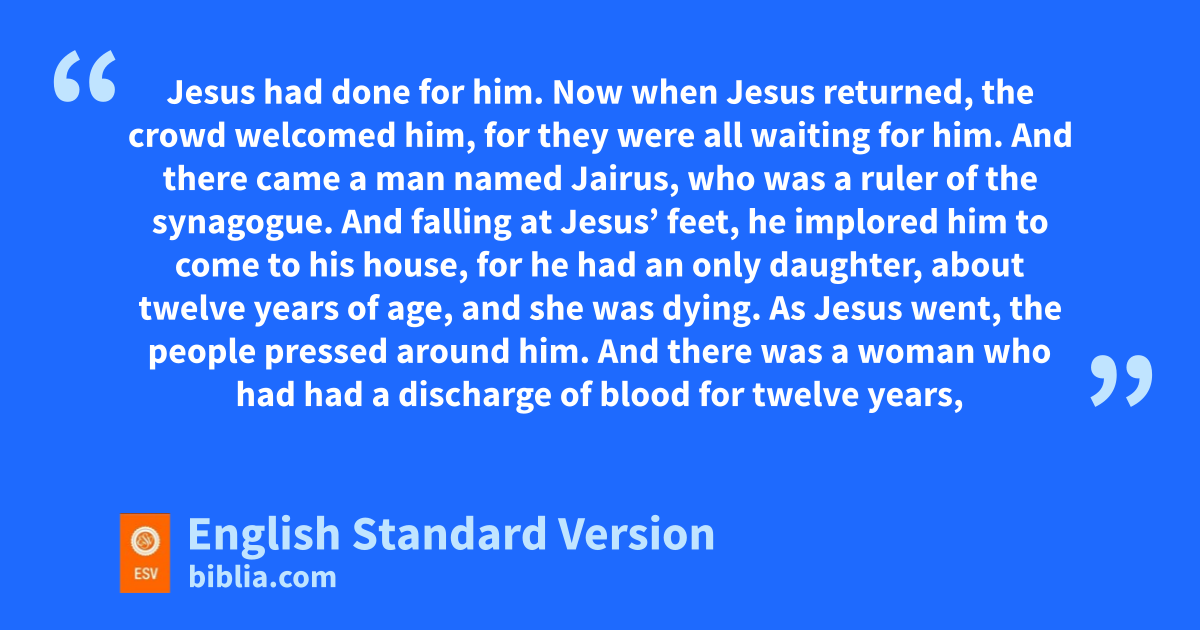 40 Now when Jesus returned, the crowd owelcomed him, for they were all waiting for him. 41 pAnd there came a man named Jairus, who was qa ruler of the synagogue. And falling at Jesus’ feet, he implored him to come to his house, 42 for he had ran only daughter, about twelve years of age, and she was dying.