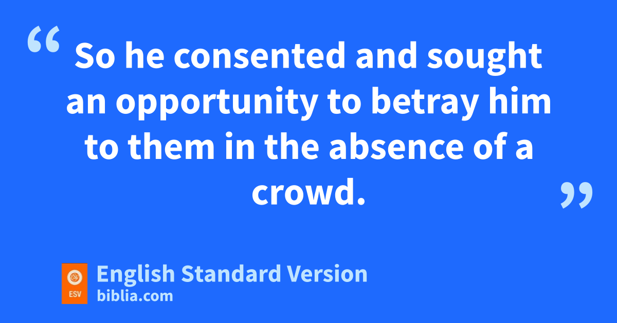 3 uThen vSatan entered into wJudas called Iscariot, who was of the number of the twelve. 4 He went away and conferred with the chief priests and xofficers how he might betray him to them. 5 And they were glad, and agreed to give him money. 6 So he consented and sought an opportunity to ybetray him to them in the absence of a crowd.