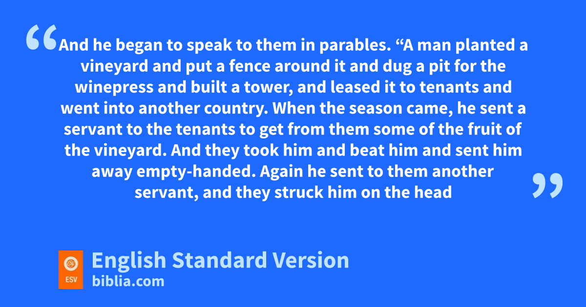 12 bAnd he began to speak to them in parables. “A man planted ca vineyard dand put a fence around it and dug a pit for the winepress and built a tower, and eleased it to tenants and fwent into another country. 2 When the season came, he sent a servant1 to the tenants to get from them some of the fruit of the vineyard. 3 gAnd they took him and beat him and sent him away empty-handed. 4 gAgain hhe sent to them another servant, and ithey struck him on the head and jtreated him shamefully. 5 gAnd he sent another, and him they killed. And so with many others: some they beat, and some they killed. 6 He had still one other, ka beloved son. lFinally he sent him to them, saying, ‘They will respect my son.’ 7 But those tenants said to one another, m‘This is the heir. Come, nlet us kill him, and the inheritance will be ours.’ 8 And they took him and killed him and othrew him out of the vineyard. 9 What will the owner of the vineyard do? pHe will qcome and destroy the tenants and rgive the vineyard to others. 10 sHave you not read tthis Scripture: