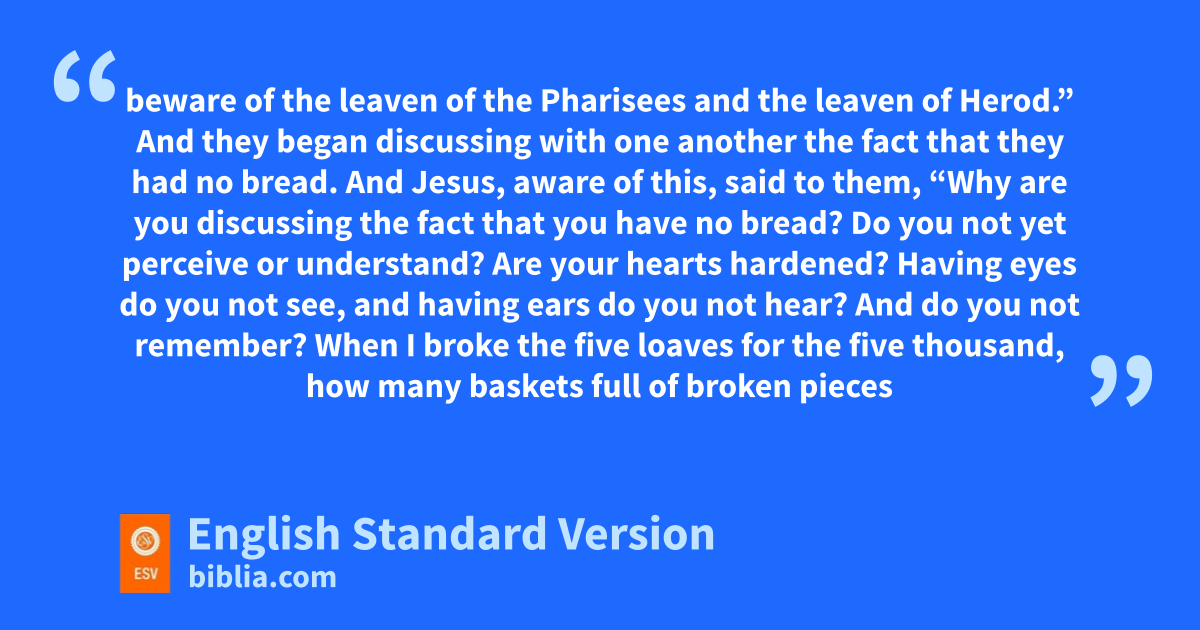 14 Now they had forgotten to bring bread, and they had only one loaf with them in the boat. 15 And he cautioned them, saying, “Watch out; abeware of bthe leaven of the Pharisees and the leaven of cHerod.”2 16 And they began discussing with one another the fact that they had no bread. 17 And dJesus, aware of this, said to them, “Why are you discussing the fact that you have no bread? eDo you not yet perceive for understand? fAre your hearts hardened? 18 gHaving eyes do you not see, and having ears do you not hear? And do you not remember? 19 When I broke hthe five loaves for the five thousand, how many baskets full of broken pieces did you take up?” They said to him, “Twelve.” 20 “And ithe seven for the four thousand, how many baskets full of broken pieces did you take up?” And they said to him, “Seven.” 21 And he said to them, “Do you not yet understand?”