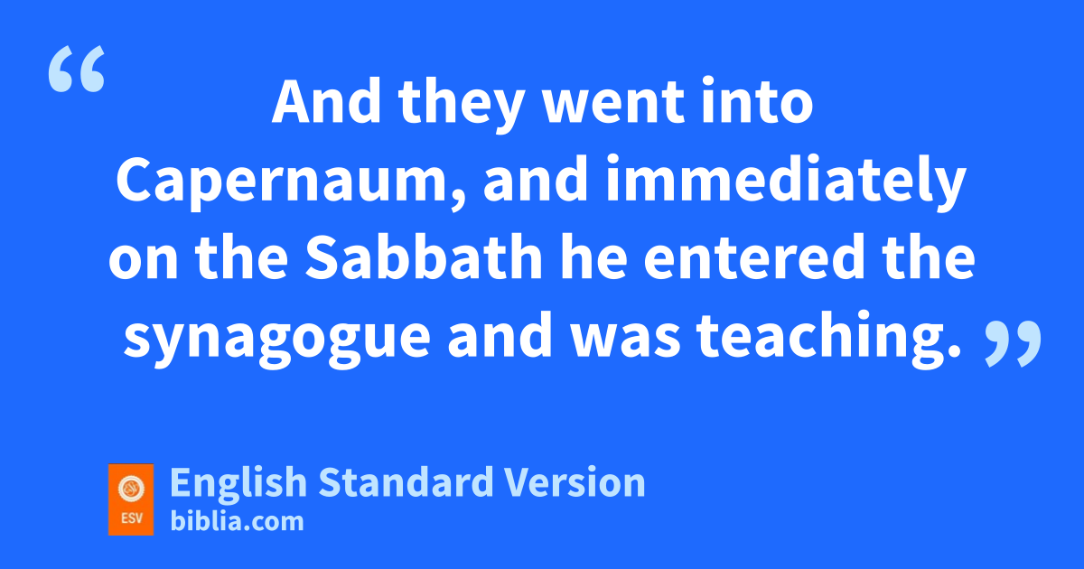 21 jAnd they went into Capernaum, and immediately kon the Sabbath lhe entered the synagogue and was teaching. 22 And mthey were astonished at his teaching, mfor he taught them as one who had authority, and not as the scribes. 23 And immediately there was in their synagogue a man with an unclean spirit. And he cried out, 24 n“What have you to do with us, Jesus of Nazareth? Have you come to destroy us? oI know who you are—pthe Holy One of God.” 25 But Jesus qrebuked him, saying, “Be silent, and come out of him!” 26 And the unclean spirit, rconvulsing him and scrying out with a loud voice, came out of him. 27 And they were all tamazed, so that they questioned among themselves, saying, “What is this? uA new teaching with authority! He commands even the unclean spirits, and they obey him.” 28 And at once his fame spread everywhere throughout all the surrounding region of Galilee.