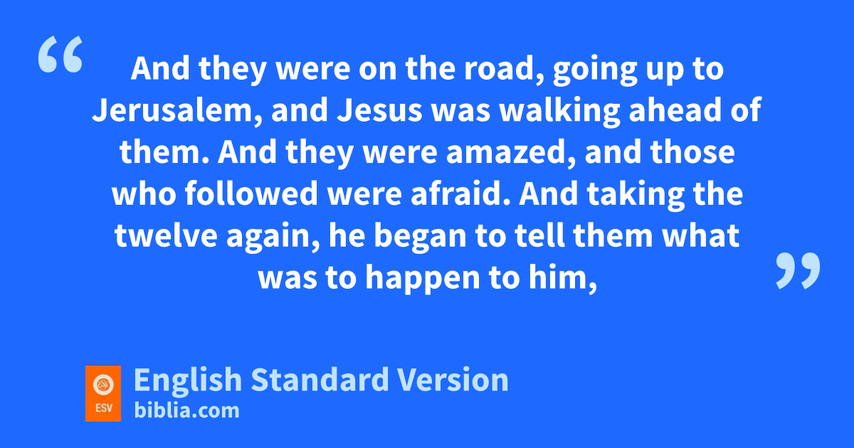 32 tAnd they were on the road, going up to Jerusalem, and uJesus was walking ahead of them. And vthey were amazed, and those who followed were afraid. And taking the twelve again, he began to tell them what was to happen to him, 33 saying, “See, wwe are going up to Jerusalem, and the Son of Man will be delivered over to the chief priests and the scribes, and they will xcondemn him to death and ydeliver him over to the Gentiles. 34 And they will zmock him and aspit on him, and flog him and kill him. And bafter three days he will rise.”