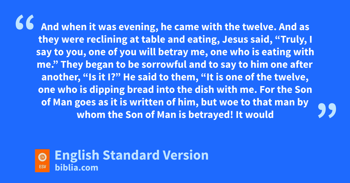 17 wAnd when it was evening, he came with the twelve. 18 And as they were reclining at table and eating, xJesus said, “Truly, I say to you, one of you will betray me, yone who is eating with me.” 19 They began to be sorrowful and to say to him one after another, “Is it I?” 20 He said to them, “It is zone of the twelve, yone who is dipping bread into the dish with me. 21 For the Son of Man goes aas it is written of him, but bwoe to that man by whom the Son of Man is betrayed! cIt would have been better for that man if he had not been born.”