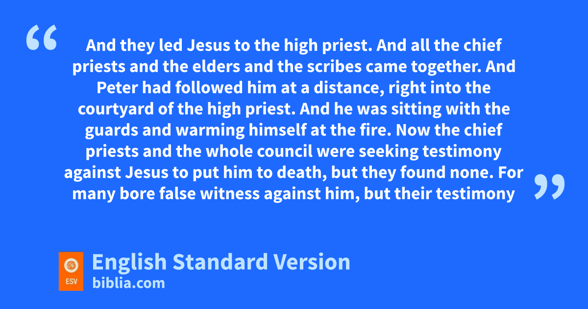 53 vAnd wthey led Jesus to the high priest. And all the chief priests and the elders and the scribes came together. 54 wAnd xPeter had followed him at a distance, yright into zthe courtyard of the high priest. And he was sitting with athe guards and bwarming himself at the fire. 55 Now the chief priests and the whole council6 were seeking testimony against Jesus to put him to death, but they found none. 56 cFor many bore false witness against him, but their testimony ddid not agree. 57 And some stood up and bore false witness against him, saying, 58 e“We heard him say, f‘I will destroy this temple gthat is made with hands, and in three days I will build another, hnot made with hands.’ ” 59 Yet even about this their testimony did not agree. 60 And the high priest stood up in the midst and asked Jesus, “Have you no answer to make? What is it that these men testify against you?”7 61 But ihe remained silent and made no answer. jAgain the high priest asked him, “Are you kthe Christ, the Son of lthe Blessed?” 62 And Jesus said, “I am, and myou will see the Son of Man nseated at the right hand of Power, and mcoming with the clouds of heaven.” 63 And the high priest otore his garments and said, “What further witnesses do we need? 64 You have heard phis blasphemy. What is your decision?” And they qall condemned him as rdeserving death. 65 sAnd some began tto spit on him and uto cover his face and to strike him, saying to him, “Prophesy!” And the guards received him vwith blows.