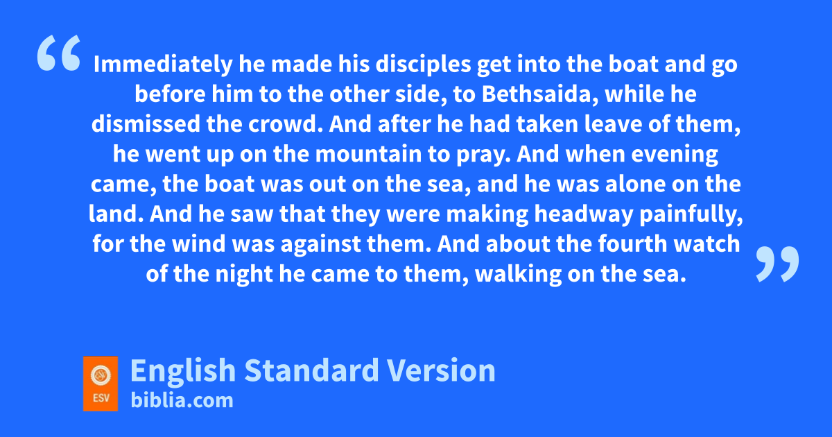 45 wImmediately he xmade his disciples get into ythe boat and go before him to the other side, zto Bethsaida, while he dismissed the crowd. 46 And after he had taken leave of them, ahe went up on the mountain to pray. 47 And when bevening came, the boat was out on the sea, and he was alone on the land. 48 And he saw that they were making headway painfully, for the wind was against them. And about bthe fourth watch of the night8 he came to them, walking on the sea. cHe meant to pass by them, 49 but when they saw him walking on the sea they thought it was a ghost, and cried out, 50 for they all saw him and dwere terrified. But immediately he spoke to them and said, e“Take heart; it is I. eDo not be afraid.” 51 And he got into the boat with them, and the wind ceased. And they were utterly astounded, 52 for fthey did not understand about the loaves, but their hearts gwere hardened.