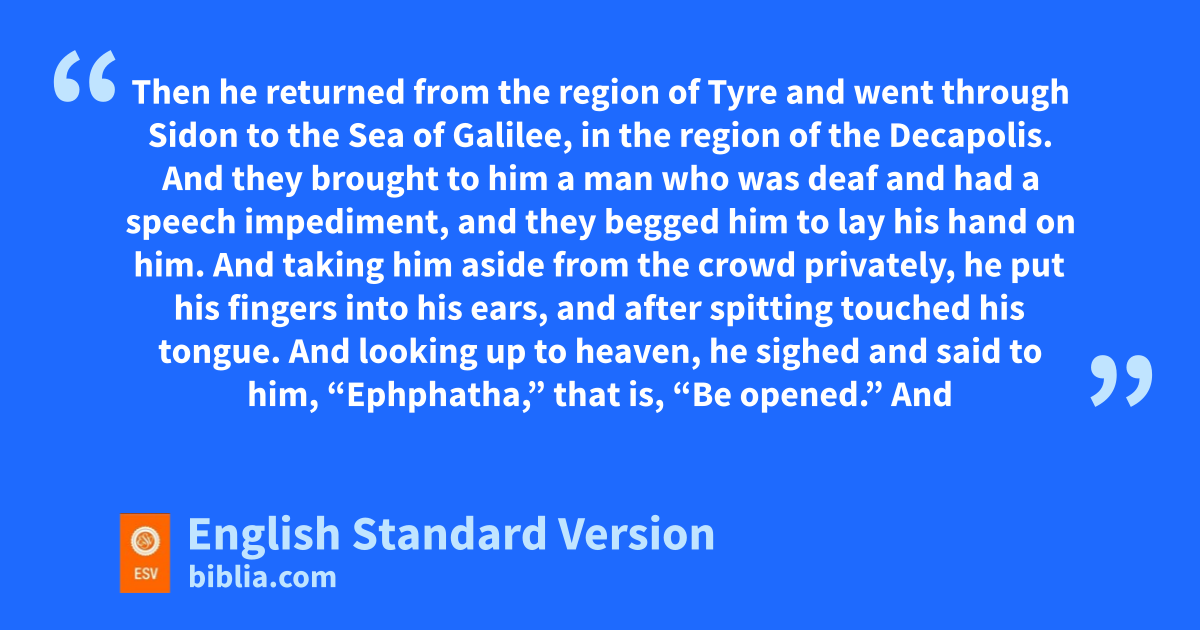 31 aThen he returned from the region of Tyre and went through Sidon to bthe Sea of Galilee, in the region of the cDecapolis. 32 And they brought to him da man who was deaf and dhad a speech impediment, and they begged him to elay his hand on him. 33 And ftaking him aside from the crowd privately, he put his fingers into his ears, and fafter spitting touched his tongue. 34 And glooking up to heaven, hhe sighed and said to him, “Ephphatha,” that is, “Be opened.” 35 dAnd his ears were opened, his tongue was released, and he spoke plainly. 36 And iJesus8 charged them to tell no one. But jthe more he charged them, the more zealously they proclaimed it. 37 And they were kastonished beyond measure, saying, “He has done all things well. He even makes the deaf hear and the mute speak.”