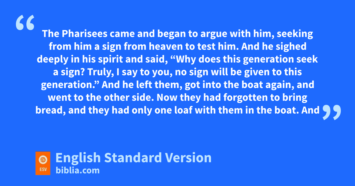 11 tThe Pharisees came and began to argue with him, useeking from him va sign from heaven wto test him. 12 And xhe sighed deeply yin his spirit and said, “Why does this generation seek a sign? Truly, I say to you, no sign will be given to this generation.” 13 And zhe left them, got into the boat again, and went to the other side.