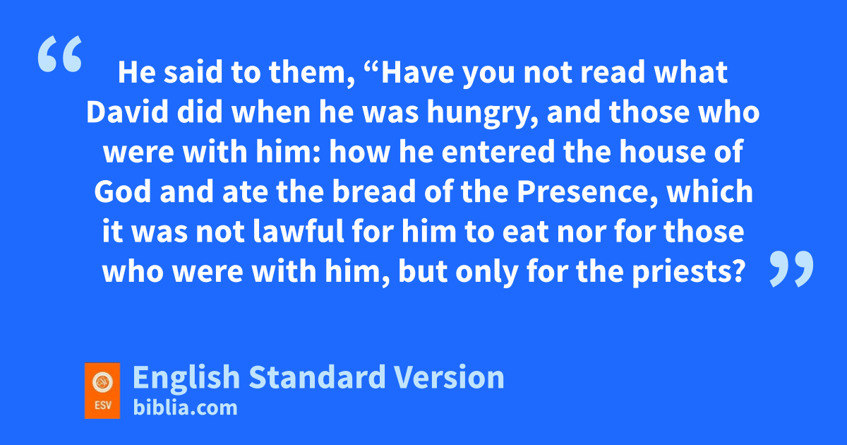 12 At that time wJesus went through the grainfields on the Sabbath. His disciples were hungry, and xthey began to pluck heads of grain and to eat. 2 But when the Pharisees saw it, they said to him, y“Look, your disciples are doing zwhat is not lawful to do on the Sabbath.” 3 He said to them, a“Have you not read what David did when he was hungry, and those who were with him: 4 how he entered the house of God and ate bthe bread of the Presence, which it was not lawful for him to eat nor for those who were with him, but only for the priests? 5 Or have you not read cin the Law how on the Sabbath the priests in the temple profane the Sabbath and are guiltless? 6 I tell you, dsomething greater than the temple is here. 7 And if you had known ewhat this means, f‘I desire mercy, and not sacrifice,’ you would not have condemned the guiltless. 8 For gthe Son of Man is lord of the Sabbath.”