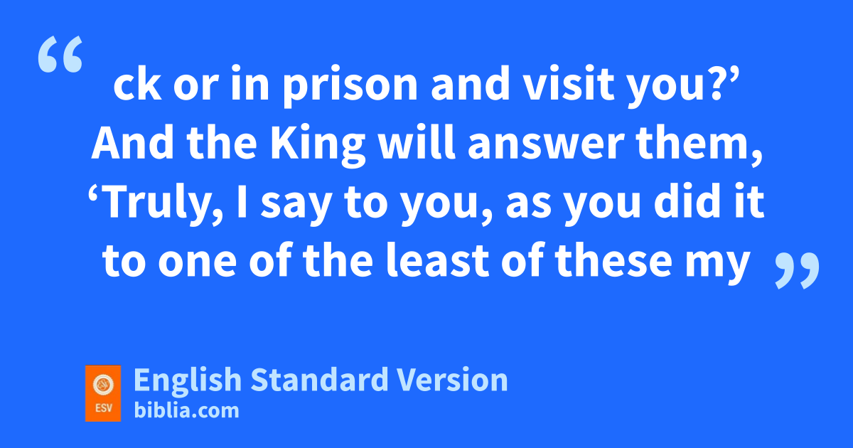 31 i“When the Son of Man comes in his glory, and all the angels with him, jthen he will sit on his glorious throne. 32 Before him kwill be gathered lall the nations, and mhe will separate people one from another as a shepherd separates nthe sheep from the goats. 33 And he will place the sheep on his right, but the goats on the left. 34 Then othe King will say to pthose on his right, ‘Come, you qwho are blessed by my Father, rinherit sthe kingdom tprepared for you ufrom the foundation of the world. 35 For vI was hungry and you gave me food, I was thirsty and you wgave me drink, xI was a stranger and you welcomed me, 36 vI was naked and you clothed me, yI was sick and you zvisited me, aI was in prison and you came to me.’ 37 Then the righteous will answer him, saying, ‘Lord, when did we see you hungry and feed you, or thirsty and give you drink? 38 And when did we see you a stranger and welcome you, or naked and clothe you? 39 And when did we see you sick or in prison and visit you?’ 40 And bthe King will answer them, c‘Truly, I say to you, as you did it to one of the least of these dmy brothers,6 you did it to me.’
