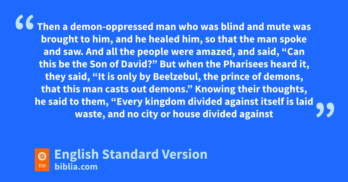 22 wThen a demon-oppressed man who was blind and mute was brought to him, and he healed him, so that the man spoke and saw. 23 xAnd all the people were amazed, and said, x“Can this be the Son of David?” 24 But when the Pharisees heard it, they said, y“It is only by Beelzebul, the prince of demons, that this man casts out demons.” 25 zKnowing their thoughts, ahe said to them, “Every kingdom divided against itself is laid waste, and no city or house divided against itself will stand. 26 And if Satan casts out Satan, he is divided against himself. How then will his kingdom stand? 27 And if I cast out demons by Beelzebul, bby whom do cyour sons cast them out? Therefore they will be your judges. 28 But if it is dby the Spirit of God that I cast out demons, then ethe kingdom of God has come upon you. 29 Or fhow can someone enter a strong man’s house and plunder his goods, unless he first binds the strong man? Then indeed ghe may plunder his house. 30 hWhoever is not with me is against me, and whoever does not gather with me scatters. 31 iTherefore I tell you, every sin and blasphemy will be forgiven people, but jthe blasphemy against the Spirit will not be forgiven. 32 And whoever speaks a word kagainst the Son of Man lwill be forgiven, but jwhoever speaks against the Holy Spirit will not be forgiven, either in mthis age or in the age to come.