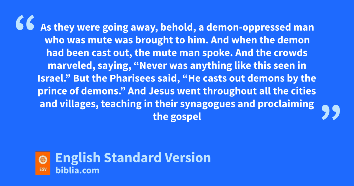 32 As they were going away, behold, a kdemon-oppressed man who was mute lwas brought to him. 33 And when the demon had been cast out, the mute man spoke. And the crowds mmarveled, saying, “Never was anything like this seen in Israel.” 34 But the Pharisees said, “He casts out demons by the prince of demons.”