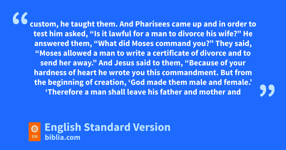 2 And Pharisees came up and in order bto test him asked, c“Is it lawful for a man to divorce his wife?” 3 He answered them, “What did Moses command you?” 4 They said, d“Moses allowed a man to write a certificate of divorce and to send her away.” 5 And Jesus said to them, “Because of your ehardness of heart he wrote you this commandment. 6 But ffrom the beginning of creation, ‘God made them gmale and female.’ 7 h‘Therefore a man shall leave his father and mother and hold fast to his wife,1 8 and ithe two shall become one flesh.’ So they are no longer two but one flesh. 9 jWhat therefore God has joined together, let not man separate.”