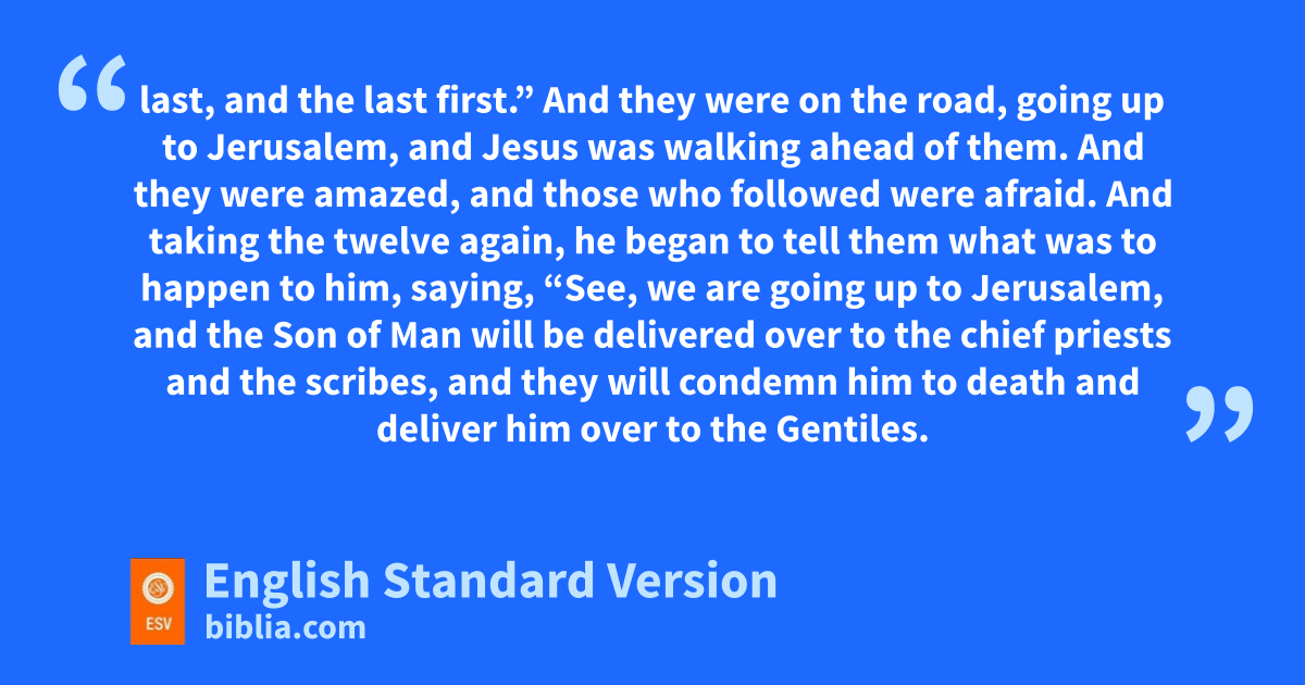 32 tAnd they were on the road, going up to Jerusalem, and uJesus was walking ahead of them. And vthey were amazed, and those who followed were afraid. And taking the twelve again, he began to tell them what was to happen to him, 33 saying, “See, wwe are going up to Jerusalem, and the Son of Man will be delivered over to the chief priests and the scribes, and they will xcondemn him to death and ydeliver him over to the Gentiles. 34 And they will zmock him and aspit on him, and flog him and kill him. And bafter three days he will rise.”