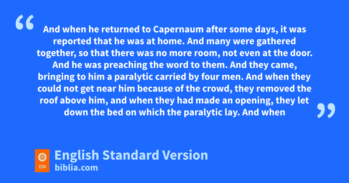 2 And when he returned to tCapernaum after some days, it was reported that he was at home. 2 And many were gathered together, so that there was no more room, not even at the door. And he was preaching the word to them. 3 uAnd they came, bringing to him a paralytic carried by four men. 4 And when they could not get near him because of the crowd, vthey removed the roof above him, and when they had made an opening, they let down the bed on which the paralytic lay. 5 And when Jesus wsaw their faith, he said to the paralytic, “Son, xyour sins are forgiven.” 6 Now some of the scribes were sitting there, questioning in their hearts, 7 “Why does this man speak like that? yHe is blaspheming! zWho can forgive sins but God alone?” 8 And immediately Jesus, aperceiving in his spirit that they thus questioned within themselves, said to them, “Why do you question these things in your hearts? 9 Which is easier, to say to the paralytic, ‘Your sins are forgiven,’ or to say, ‘Rise, take up your bed and walk’? 10 But that you may know that bthe Son of Man has authority on earth to forgive sins”—he said to the paralytic— 11 “I say to you, rise, pick up your bed, and go home.” 12 And he rose and immediately picked up his bed and went out before them all, so that they were all amazed and cglorified God, saying, “We never saw anything like this!”