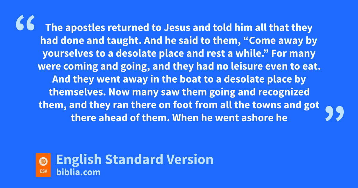 30 ijThe apostles returned to Jesus and told him all that they had done and taught. 31 And he said to them, “Come away by yourselves to a desolate place and rest a while.” For many were coming and going, and kthey had no leisure even to eat. 32 lAnd they went away in mthe boat to a desolate place by themselves. 33 Now many saw them going and nrecognized them, and they ran there on foot from all the towns and got there ahead of them. 34 When he went ashore he osaw a great crowd, and ohe had compassion on them, because they were like sheep without a shepherd. And he began to teach them many things. 35 And when it grew late, his disciples came to him and said, “This is a desolate place, and the hour is now late. 36 pSend them away to go into the surrounding countryside and villages and buy themselves something to eat.” 37 But he answered them, q“You give them something to eat.” And rthey said to him, s“Shall we go and buy two hundred denarii7 worth of bread and give it to them to eat?” 38 And he said to them, “How many loaves do you have? Go and see.” And when they had found out, they said, t“Five, and two fish.” 39 Then he commanded them all to sit down in groups on the green grass. 40 So they sat down in groups, by hundreds and by fifties. 41 And taking the five loaves and the two fish, he ulooked up to heaven and vsaid a blessing and broke the loaves and gave them to the disciples to set before the people. And he divided the two fish among them all. 42 And they all ate and were satisfied. 43 And they took up twelve baskets full of broken pieces and of the fish. 44 And those who ate the loaves were five thousand men.