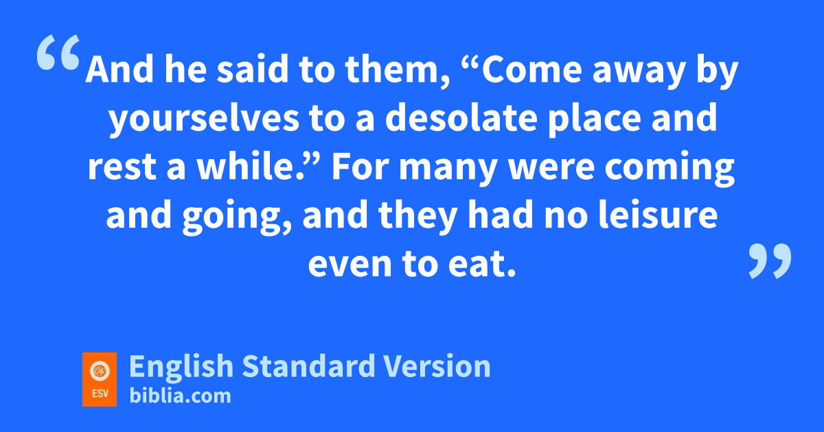 30 ijThe apostles returned to Jesus and told him all that they had done and taught. 31 And he said to them, “Come away by yourselves to a desolate place and rest a while.” For many were coming and going, and kthey had no leisure even to eat. 32 lAnd they went away in mthe boat to a desolate place by themselves. 33 Now many saw them going and nrecognized them, and they ran there on foot from all the towns and got there ahead of them. 34 When he went ashore he osaw a great crowd, and ohe had compassion on them, because they were like sheep without a shepherd. And he began to teach them many things. 35 And when it grew late, his disciples came to him and said, “This is a desolate place, and the hour is now late. 36 pSend them away to go into the surrounding countryside and villages and buy themselves something to eat.” 37 But he answered them, q“You give them something to eat.” And rthey said to him, s“Shall we go and buy two hundred denarii7 worth of bread and give it to them to eat?” 38 And he said to them, “How many loaves do you have? Go and see.” And when they had found out, they said, t“Five, and two fish.” 39 Then he commanded them all to sit down in groups on the green grass. 40 So they sat down in groups, by hundreds and by fifties. 41 And taking the five loaves and the two fish, he ulooked up to heaven and vsaid a blessing and broke the loaves and gave them to the disciples to set before the people. And he divided the two fish among them all. 42 And they all ate and were satisfied. 43 And they took up twelve baskets full of broken pieces and of the fish. 44 And those who ate the loaves were five thousand men.