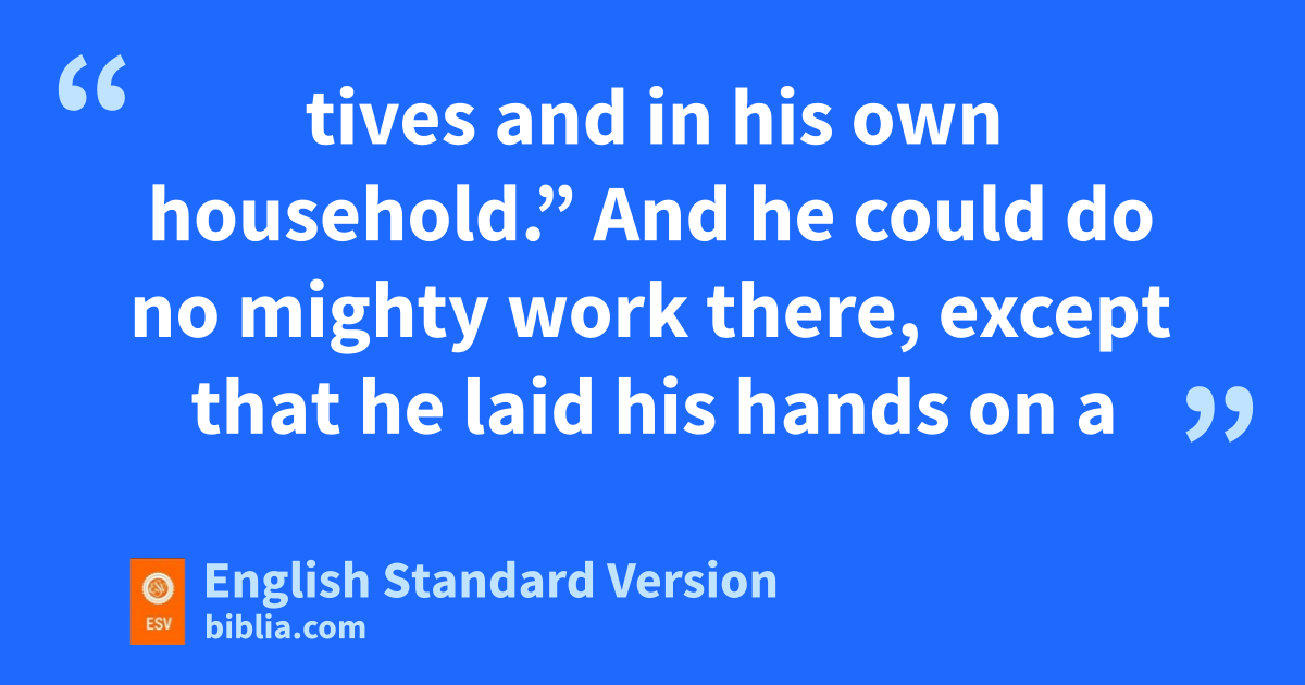 6 bHe went away from there and came to chis hometown, and his disciples followed him. 2 And don the Sabbath he began to teach in the synagogue, and emany who heard him were astonished, saying, “Where did this man get these things? What is the wisdom given to him? How are such mighty works done by his hands? 3 fIs not this gthe carpenter,1 the son of Mary and hbrother of James and Jesus and Judas and Simon? And are not his sisters here with us?” And ithey took offense at him. 4 And Jesus said to them, j“A prophet is not without honor, except in his hometown and among his relatives and in his own household.” 5 And khe could do no mighty work there, except that lhe laid his hands on a few sick people and healed them. 6 And mhe marveled because of their unbelief.