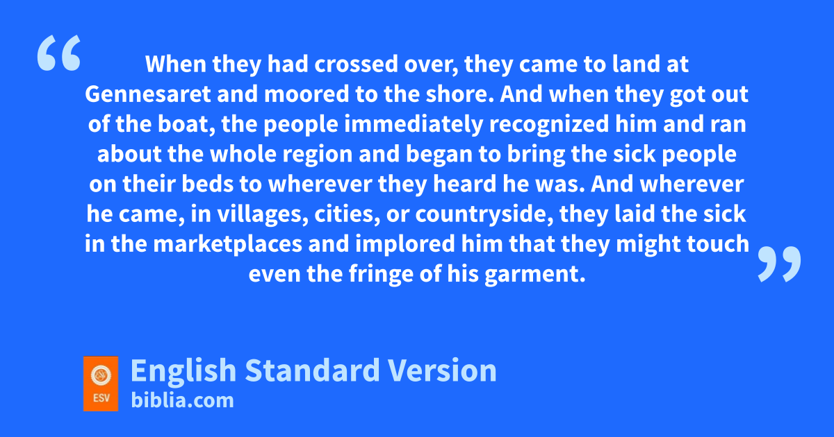 53 hWhen they had crossed over, they came to land at iGennesaret and moored to the shore. 54 And when they got out of the boat, the people immediately jrecognized him 55 and ran about the whole region and began to bring kthe sick people lon their beds to wherever they heard he was. 56 And wherever he came, in villages, cities, or countryside, mthey laid the sick in the marketplaces and implored him that they might touch even nthe fringe of his garment. And oas many as touched it were made well.