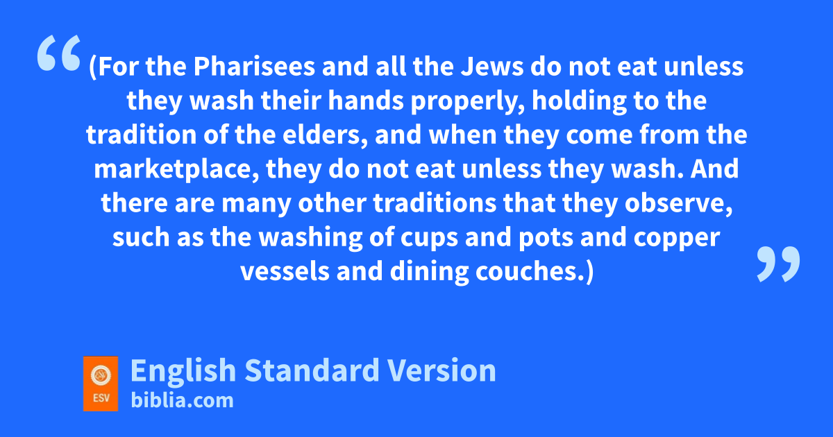7 pNow when the Pharisees gathered to him, with some of the scribes qwho had come from Jerusalem, 2 they saw that some of his disciples ate with hands that were rdefiled, that is, unwashed. 3 (For the Pharisees and all the Jews do not eat unless they wash their hands properly,1 holding to sthe tradition of tthe elders, 4 and when they come from the marketplace, they do not eat unless they wash.2 And there are many other traditions that they observe, such as uthe washing of vcups and pots and copper vessels and dining couches.3) 5 And the Pharisees and the scribes asked him, “Why do your disciples not walk according to sthe tradition of tthe elders, wbut eat with rdefiled hands?” 6 And he said to them, “Well did Isaiah prophesy of you xhypocrites, as it is written,