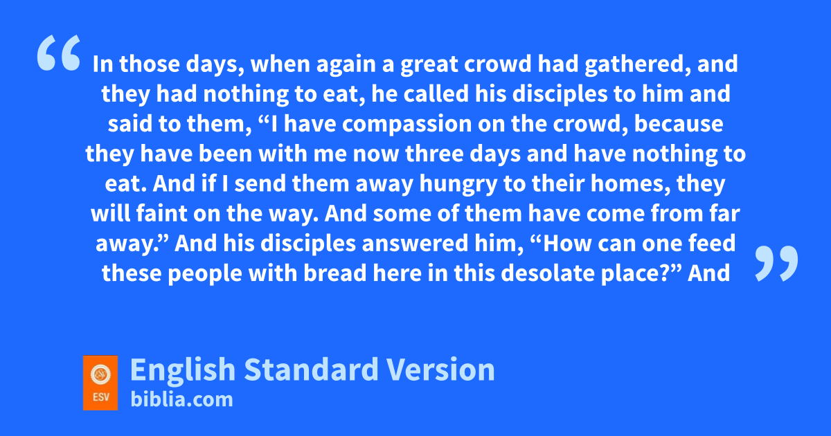 8 lIn those days, when again a great crowd had gathered, and they had nothing to eat, he called his disciples to him and said to them, 2 m“I have compassion on the crowd, because they have been with me now three days and have nothing to eat. 3 And if I send them away hungry to their homes, they will faint on the way. And some of them have come from far away.” 4 And his disciples answered him, “How can one feed these people with bread here in this desolate place?” 5 And he asked them, “How many loaves do you have?” They said, n“Seven.” 6 And he directed the crowd to sit down on the ground. And he took the seven loaves, and ohaving given thanks, he broke them and gave them to his disciples to set before the people; and they set them before the crowd. 7 And they had a few small fish. And phaving blessed them, he said that these also should be set before them. 8 And qthey ate and were satisfied. And they took up the broken pieces left over, nseven baskets full. 9 And there were about four thousand people. And he sent them away. 10 And immediately he got into rthe boat with his disciples and went to the district of sDalmanutha.1