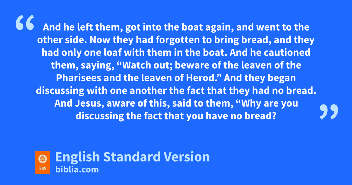 14 Now they had forgotten to bring bread, and they had only one loaf with them in the boat. 15 And he cautioned them, saying, “Watch out; abeware of bthe leaven of the Pharisees and the leaven of cHerod.”2 16 And they began discussing with one another the fact that they had no bread. 17 And dJesus, aware of this, said to them, “Why are you discussing the fact that you have no bread? eDo you not yet perceive for understand? fAre your hearts hardened? 18 gHaving eyes do you not see, and having ears do you not hear? And do you not remember? 19 When I broke hthe five loaves for the five thousand, how many baskets full of broken pieces did you take up?” They said to him, “Twelve.” 20 “And ithe seven for the four thousand, how many baskets full of broken pieces did you take up?” And they said to him, “Seven.” 21 And he said to them, “Do you not yet understand?”