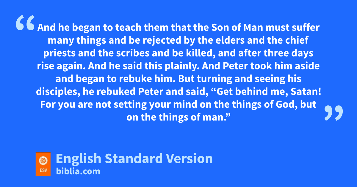 31 uAnd he began to teach them that vthe Son of Man must wsuffer many things and xbe rejected by the elders and the chief priests and the scribes and be killed, and yafter three days rise again. 32 And he said this zplainly. And Peter took him aside and began to rebuke him. 33 But turning and seeing his disciples, he rebuked Peter and said, a“Get behind me, Satan! For you bare not setting your mind on the things of God, but on the things of man.”