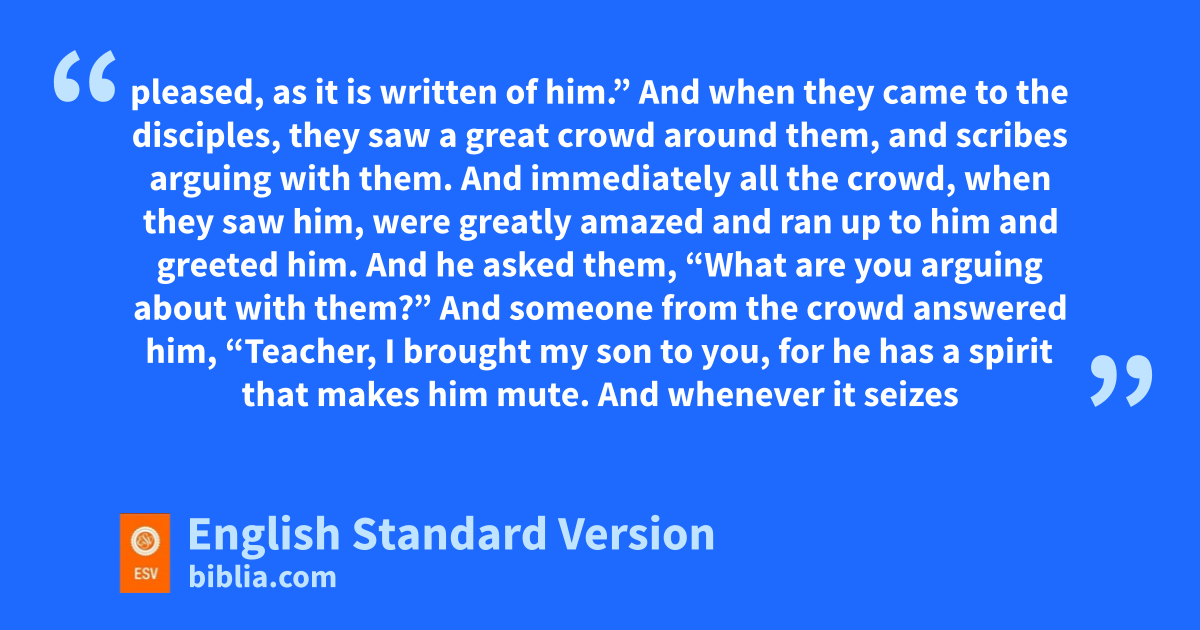 14 jAnd when they came to the disciples, they saw a great crowd around them, and scribes arguing with them. 15 And immediately all the crowd, when they saw him, kwere greatly amazed and ran up to him and greeted him. 16 And he asked them, “What are you arguing about with them?” 17 And someone from the crowd answered him, “Teacher, I brought my son to you, for he has la spirit that makes him mute. 18 And whenever it seizes him, it throws him down, and he foams and grinds his teeth and becomes rigid. So I asked your disciples to cast it out, and mthey were not able.” 19 And he answered them, “O nfaithless generation, nhow long am I to be with you? How long am I to bear with you? Bring him to me.” 20 And they brought the boy to him. And when the spirit saw him, immediately it oconvulsed the boy, and he fell on the ground and rolled about, foaming at the mouth. 21 And Jesus asked his father, “How long has this been happening to him?” And he said, “From childhood. 22 And it has often cast him into fire and into water, to destroy him. But pif you can do anything, have compassion on us and help us.” 23 And Jesus said to him, p“ ‘If you can’t believe,’! qAll things are possible for one who believes.” 24 Immediately the father of the child cried out4 and said, “I believe; rhelp my unbelief!” 25 And when Jesus saw that sa crowd came running together, he rebuked the unclean spirit, saying to it, t“You mute and deaf spirit, I command you, come out of him and never enter him again.” 26 And after crying out and oconvulsing him terribly, it came out, and the boy was like a corpse, so that most of them said, “He is dead.” 27 But Jesus utook him by the hand and lifted him up, and he arose. 28 And when he had ventered the house, his disciples asked him privately, “Why could we not cast it out?” 29 And he said to them, “This kind cannot be driven out by anything but prayer.”5