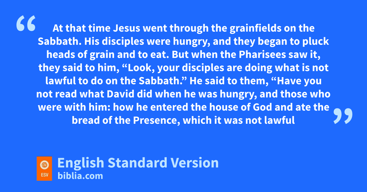 12 At that time wJesus went through the grainfields on the Sabbath. His disciples were hungry, and xthey began to pluck heads of grain and to eat. 2 But when the Pharisees saw it, they said to him, y“Look, your disciples are doing zwhat is not lawful to do on the Sabbath.” 3 He said to them, a“Have you not read what David did when he was hungry, and those who were with him: 4 how he entered the house of God and ate bthe bread of the Presence, which it was not lawful for him to eat nor for those who were with him, but only for the priests? 5 Or have you not read cin the Law how on the Sabbath the priests in the temple profane the Sabbath and are guiltless? 6 I tell you, dsomething greater than the temple is here. 7 And if you had known ewhat this means, f‘I desire mercy, and not sacrifice,’ you would not have condemned the guiltless. 8 For gthe Son of Man is lord of the Sabbath.”