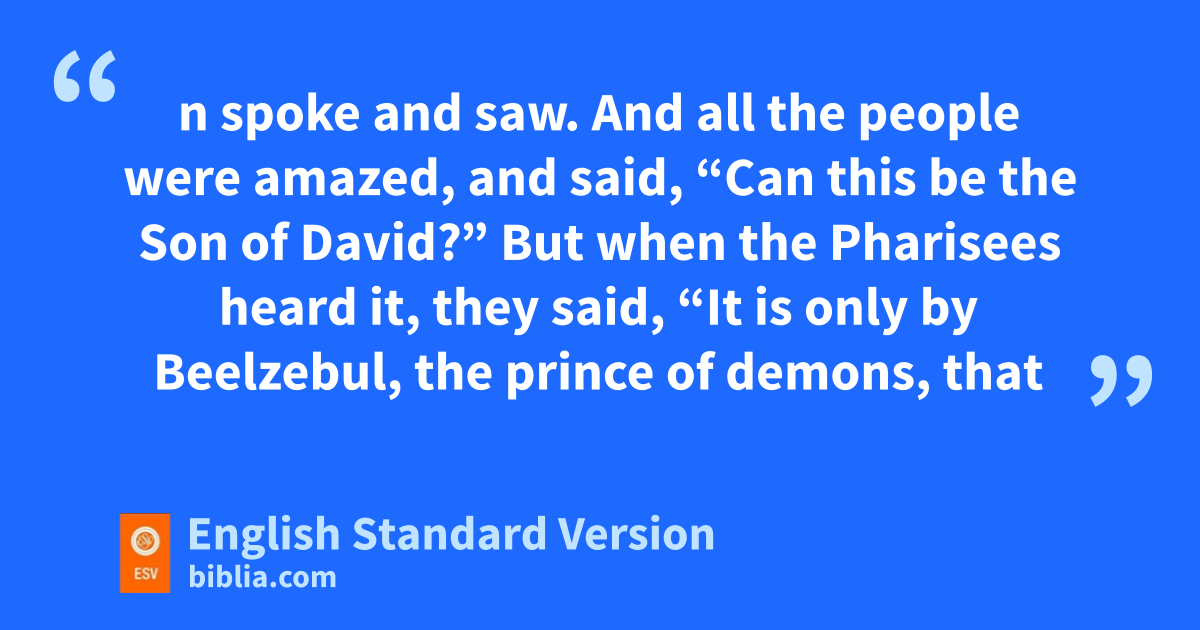 22 wThen a demon-oppressed man who was blind and mute was brought to him, and he healed him, so that the man spoke and saw. 23 xAnd all the people were amazed, and said, x“Can this be the Son of David?” 24 But when the Pharisees heard it, they said, y“It is only by Beelzebul, the prince of demons, that this man casts out demons.” 25 zKnowing their thoughts, ahe said to them, “Every kingdom divided against itself is laid waste, and no city or house divided against itself will stand. 26 And if Satan casts out Satan, he is divided against himself. How then will his kingdom stand? 27 And if I cast out demons by Beelzebul, bby whom do cyour sons cast them out? Therefore they will be your judges. 28 But if it is dby the Spirit of God that I cast out demons, then ethe kingdom of God has come upon you. 29 Or fhow can someone enter a strong man’s house and plunder his goods, unless he first binds the strong man? Then indeed ghe may plunder his house. 30 hWhoever is not with me is against me, and whoever does not gather with me scatters. 31 iTherefore I tell you, every sin and blasphemy will be forgiven people, but jthe blasphemy against the Spirit will not be forgiven. 32 And whoever speaks a word kagainst the Son of Man lwill be forgiven, but jwhoever speaks against the Holy Spirit will not be forgiven, either in mthis age or in the age to come.