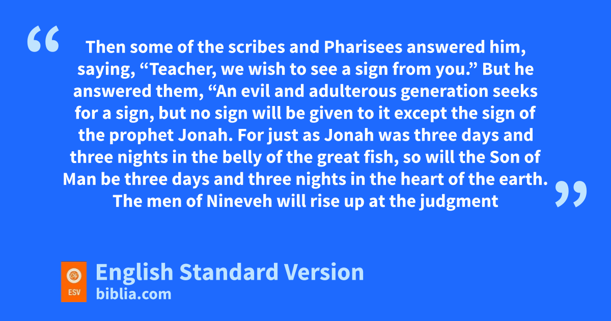 38 Then some of the scribes and Pharisees answered him, saying, “Teacher, wwe wish to see a sign from you.” 39 But he answered them, x“An evil and yadulterous generation seeks for a sign, but no sign will be given to it except the sign of the prophet Jonah. 40 For zjust as Jonah was three days and three nights in the belly of the great fish, aso will the Son of Man be three days and three nights in the heart of the earth. 41 bThe men of Nineveh will rise up at the judgment with this generation and ccondemn it, for dthey repented at the preaching of Jonah, and behold, esomething greater than Jonah is here. 42 fThe queen of the South will rise up at the judgment with this generation and condemn it, for she came from the ends of the earth to hear the wisdom of Solomon, and behold, esomething greater than Solomon is here.