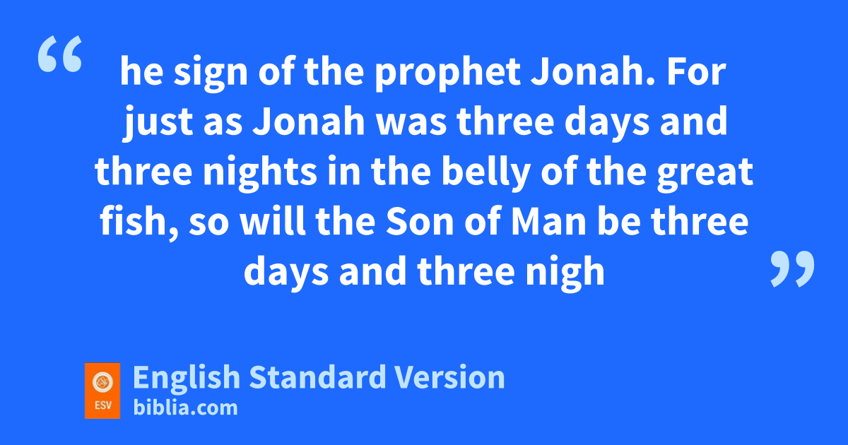 38 Then some of the scribes and Pharisees answered him, saying, “Teacher, wwe wish to see a sign from you.” 39 But he answered them, x“An evil and yadulterous generation seeks for a sign, but no sign will be given to it except the sign of the prophet Jonah. 40 For zjust as Jonah was three days and three nights in the belly of the great fish, aso will the Son of Man be three days and three nights in the heart of the earth. 41 bThe men of Nineveh will rise up at the judgment with this generation and ccondemn it, for dthey repented at the preaching of Jonah, and behold, esomething greater than Jonah is here. 42 fThe queen of the South will rise up at the judgment with this generation and condemn it, for she came from the ends of the earth to hear the wisdom of Solomon, and behold, esomething greater than Solomon is here.