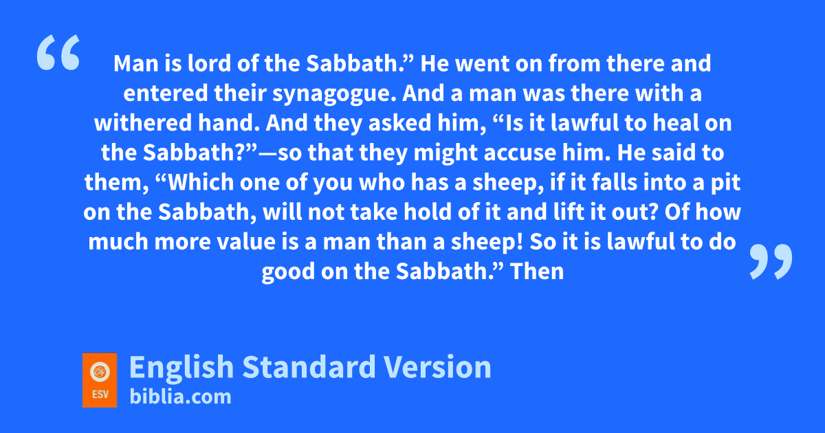 9 He went on from there and hentered their synagogue. 10 And a man was there with a withered hand. And they asked him, i“Is it lawful to heal on the Sabbath?”—jso that they might accuse him. 11 He said to them, “Which one of you who has a sheep, kif it falls into a pit on the Sabbath, will not take hold of it and lift it out? 12 lOf how much more value is a man than a sheep! So mit is lawful to do good on the Sabbath.” 13 Then he said to the man, “Stretch out your hand.” And nthe man stretched it out, and it was restored, healthy like the other. 14 But the Pharisees went out and conspired against him, how to destroy him.