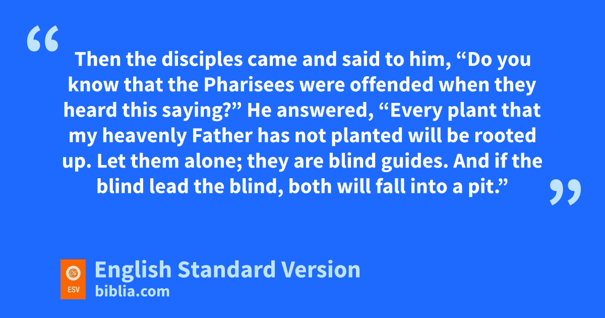 10 And he called the people to him and said to them, q“Hear and understand: 11 rit is not what goes into the mouth that defiles a person, but what comes out of the mouth; this defiles a person.” 12 Then the disciples came and said to him, “Do you know that the Pharisees were soffended when they heard this saying?” 13 He answered, t“Every plant that my heavenly Father has not planted uwill be rooted up. 14 Let them alone; vthey are blind guides.3 And wif the blind lead the blind, both will fall into a pit.” 15 But Peter said to him, x“Explain the parable to us.” 16 And he said, y“Are you also still without understanding? 17 Do you not see that zwhatever goes into the mouth passes into the stomach and is expelled?4 18 But awhat comes out of the mouth proceeds from the heart, and this defiles a person. 19 For out of the heart come bevil thoughts, cmurder, adultery, sexual immorality, theft, false witness, dslander. 20 eThese are what defile a person. But fto eat with unwashed hands does not defile anyone.”