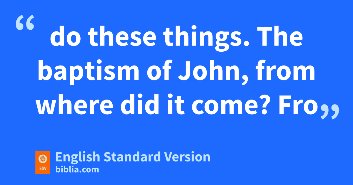23 zAnd when he entered the temple, the chief priests and the elders of the people came up to him aas he was teaching, and said, b“By what authority are you doing these things, and who gave you this authority?” 24 Jesus answered them, “I also will ask you one question, and if you tell me the answer, then I also will tell you by what authority I do these things. 25 The baptism of John, cfrom where did it come? dFrom heaven or from man?” And they discussed it among themselves, saying, “If we say, ‘From heaven,’ he will say to us, e‘Why then did you not believe him?’ 26 But if we say, ‘From man,’ fwe are afraid of the crowd, for they all hold that John was ga prophet.” 27 So they answered Jesus, “We do not know.” And he said to them, “Neither will I tell you by what authority I do these things.