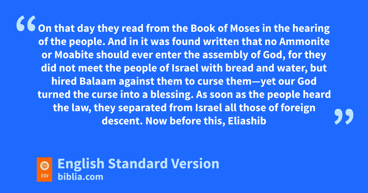 13 On that day rthey read from the Book of Moses in the hearing of the people. And in it was found written sthat no Ammonite or Moabite should ever enter the assembly of God, 2 for they did not meet the people of Israel with bread and water, but hired Balaam against them to curse them—yet our God turned the curse into a blessing. 3 As soon as the people heard the law, tthey separated from Israel all uthose of foreign descent.