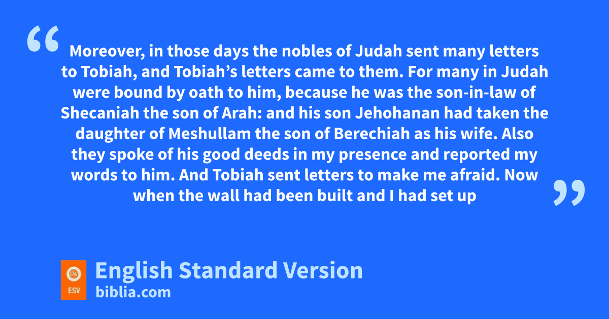 15 So the wall was finished on the twenty-fifth day of the month Elul, in fifty-two days. 16 And jwhen all our enemies heard of it, all the nations around us were afraid and fell greatly in their own esteem, kfor they perceived that this work had been accomplished with the help of our God. 17 Moreover, in those days the nobles of Judah sent many letters to Tobiah, and Tobiah’s letters came to them. 18 For many in Judah were bound by oath to him, because he was the son-in-law of Shecaniah the son of lArah: and his son Jehohanan had taken the daughter of mMeshullam the son of Berechiah as his wife. 19 Also they spoke of his good deeds in my presence and reported my words to him. And Tobiah sent letters to make me afraid.