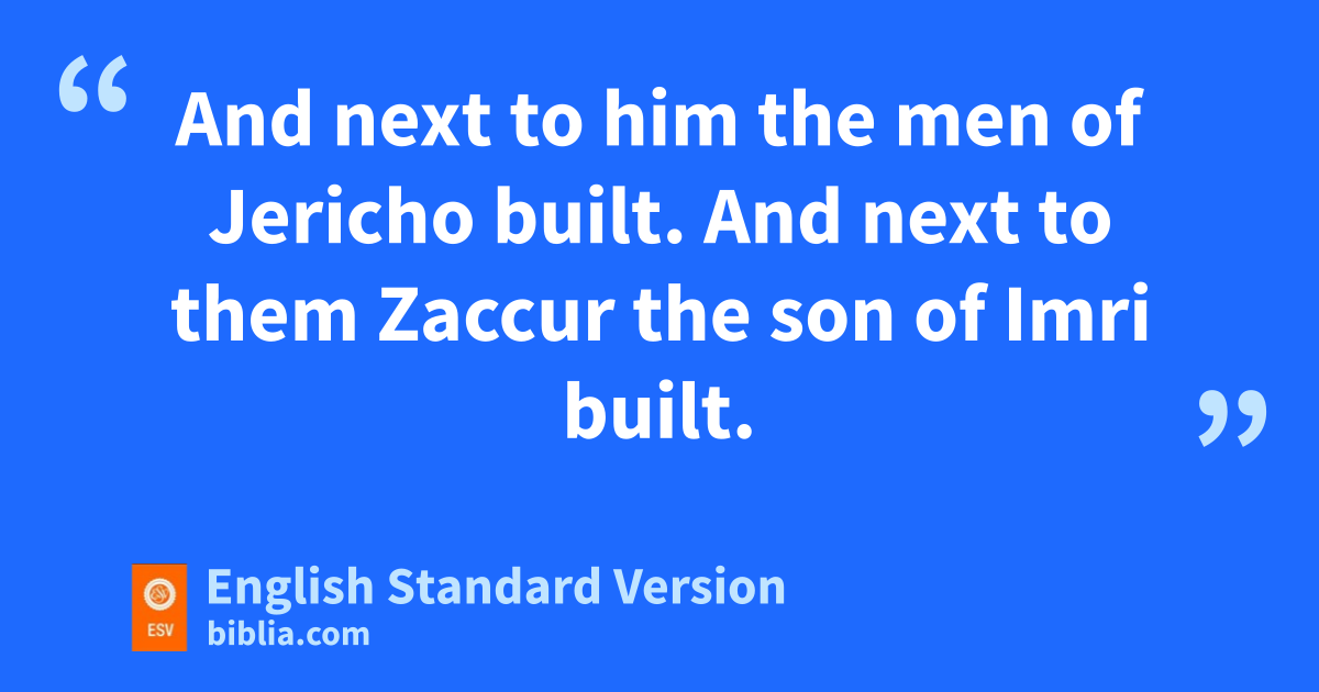 15 And Shallum the son of Col-hozeh, ruler of the district of Mizpah, repaired vthe Fountain Gate. He rebuilt it and covered it and sset its doors, its bolts, and its bars. And he built the wall of wthe Pool of Shelah of xthe king’s garden, as far as ythe stairs that go down from the city of David. 16 After him Nehemiah the son of Azbuk, ruler of half the district of Beth-zur, repaired to a point opposite zthe tombs of David, as far as athe artificial pool, and as far as the house of the mighty men. 17 After him the Levites repaired: Rehum the son of Bani. Next to him Hashabiah, ruler of half the district of Keilah, repaired for his district. 18 After him their brothers repaired: Bavvai the son of Henadad, ruler of half the district of Keilah. 19 Next to him Ezer the son of Jeshua, ruler of Mizpah, repaired another section opposite the ascent to the armory at bthe buttress.6 20 After him Baruch the son of Zabbai repaired7 another section from the buttress to the door of the house of cEliashib the high priest. 21 After him dMeremoth the son of Uriah, son of Hakkoz repaired another section from the door of the house of Eliashib to the end of the house of Eliashib. 22 After him the priests, the men of ethe surrounding area, repaired. 23 After them Benjamin and Hasshub repaired opposite their house. After them Azariah the son of Maaseiah, son of Ananiah repaired beside his own house. 24 After him Binnui the son of Henadad repaired another section, from the house of Azariah to the buttress and to fthe corner.25 Palal the son of Uzai repaired opposite the buttress and the tower projecting from the upper house of the king at gthe court of the guard. After him Pedaiah the son of Parosh 26 hand the temple servants living on iOphel repaired to a point opposite jthe Water Gate on the east and the projecting tower. 27 After him kthe Tekoites repaired another section opposite the great projecting tower as far as the wall of Ophel.