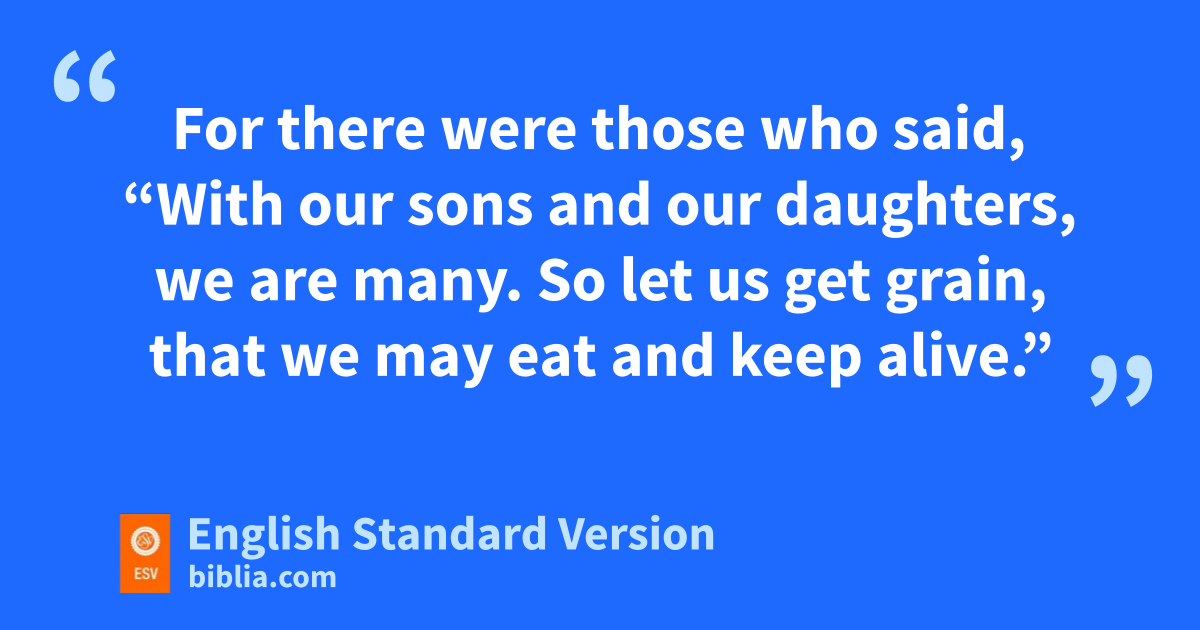 5 Now there arose fa great outcry of the people and of their wives gagainst their Jewish brothers. 2 For there were those who said, “With our sons and our daughters, we are many. So let us get grain, that we may eat and keep alive.” 3 There were also those who said, “We are mortgaging our fields, our vineyards, and our houses to get grain because of the famine.” 4 And there were those who said, “We have borrowed money for hthe king’s tax on our fields and our vineyards. 5 Now iour flesh is as the flesh of our brothers, our children are as their children. Yet jwe are forcing our sons and our daughters to be slaves, and some of our daughters have already been enslaved, but it is not in our power to help it, for other men have our fields and our vineyards.”