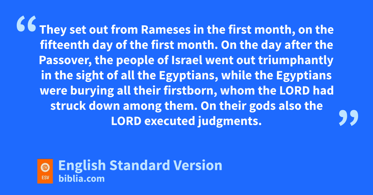 33 These are the stages of the people of Israel, when they went out of the land of Egypt by their companies under the leadership of Moses and Aaron. 2 Moses wrote down their starting places, lstage by stage, by command of the Lord, and these are their stages according to their starting places. 3 They mset out from Rameses in nthe first month, on the fifteenth day of the first month. On the day after the Passover, the people of Israel went out otriumphantly in the sight of all the Egyptians, 4 while the Egyptians were burying all their firstborn, pwhom the Lord had struck down among them. qOn their gods also the Lord executed judgments.