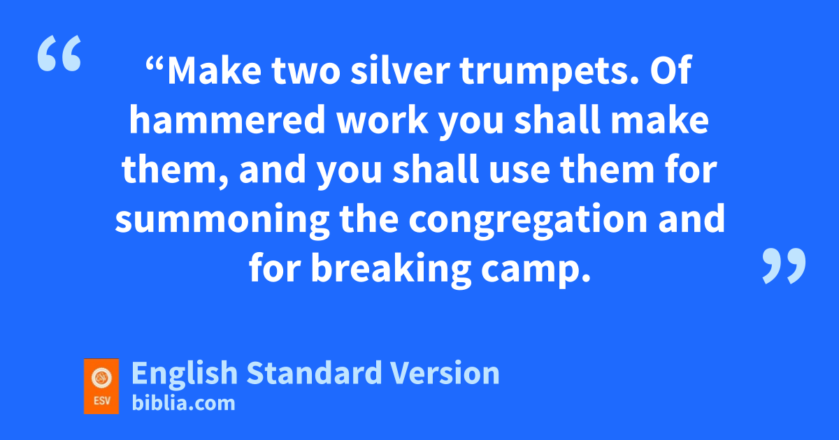 10 The Lord spoke to Moses, saying, 2 “Make two silver trumpets. Of hammered work you shall make them, and you shall use them for xsummoning the congregation and for breaking camp. 3 And when yboth are blown, all the congregation shall gather themselves to you at the entrance of the tent of meeting. 4 But if they blow only one, then zthe chiefs, the heads of the tribes of Israel, shall gather themselves to you. 5 When you blow an alarm, athe camps that are on the east side shall set out. 6 And when you blow an alarm the second time, bthe camps that are on the south side shall set out. An alarm is to be blown whenever they are to set out. 7 But when the assembly is to be gathered together, cyou shall blow a long blast, but you shall not dsound an alarm. 8 eAnd the sons of Aaron, the priests, shall blow the trumpets. The trumpets shall be to you for a perpetual statute throughout your generations. 9 And fwhen you go to war in your land against the adversary who goppresses you, then you shall dsound an alarm with the trumpets, that you may be hremembered before the Lord your God, and you shall be saved from your enemies. 10 iOn the day of your gladness also, and at your appointed feasts and jat the beginnings of your months, you shall blow the trumpets over your burnt offerings and over the sacrifices of your peace offerings. They shall be ka reminder of you before your God: I am the Lord your God.”