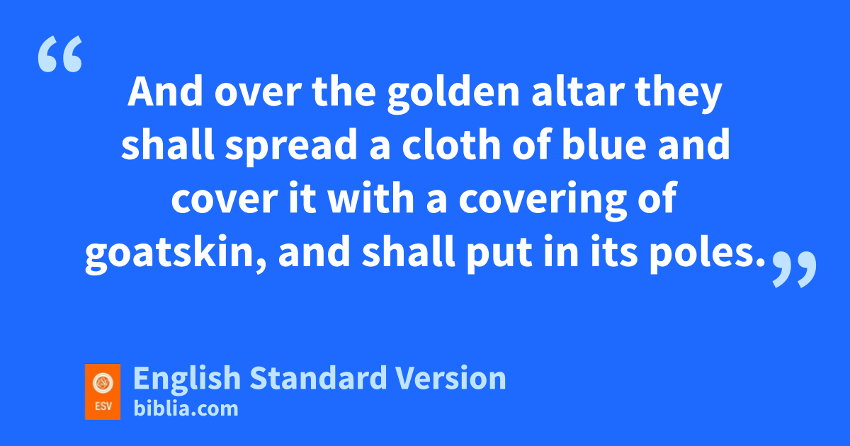 4 The Lord spoke to Moses and Aaron, saying, 2 “Take a census of the sons of Kohath from among the sons of Levi, by their clans and their fathers’ houses, 3 bfrom thirty years old up to fifty years old, all who can come on duty, to do the work in the tent of meeting. 4 This is the service of the sons of Kohath in the tent of meeting: cthe most holy things. 5 When the camp is to set out, Aaron and his sons shall go in and take down dthe veil of the screen and cover ethe ark of the testimony with it. 6 Then they shall put on it a covering of goatskin1 and spread on top of that a cloth all of blue, and shall put in its fpoles. 7 And over the gtable of the bread of the Presence they shall spread a cloth of blue and put on it the plates, the dishes for incense, the bowls, and the flagons for the drink offering; hthe regular showbread also shall be on it. 8 Then they shall spread over them a cloth of scarlet and cover the same with a covering of goatskin, and shall iput in its poles. 9 And they shall take a cloth of blue and cover jthe lampstand for the light, with its lamps, its tongs, its trays, and all the vessels for oil with which it is supplied. 10 And they shall put it with all its utensils in a covering of goatskin and put it on the carrying frame. 11 And over kthe golden altar they shall spread a cloth of blue and cover it with a covering of goatskin, and shall put in its poles. 12 And they shall take all lthe vessels of the service that are used in the sanctuary and put them in a cloth of blue and cover them with a covering of goatskin and put them on the carrying frame. 13 And they shall take away the ashes from the altar and spread a purple cloth over it. 14 And they shall put on it all the utensils of the altar, which are used for the service there, the fire pans, the forks, the shovels, and the basins, all the utensils of the altar; and they shall spread on it a covering of goatskin, and shall put in its poles. 15 And when Aaron and his sons have finished covering the sanctuary and all the furnishings of the sanctuary, as the camp sets out, after that mthe sons of Kohath shall come to carry these, nbut they must not touch the holy things, lest they die. These are the things of the tent of meeting that the sons of Kohath are to carry.