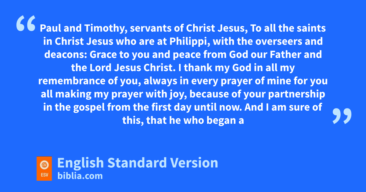 3 eI thank my God fin all my remembrance of you, 4 always in every prayer of mine for you all making my prayer with joy, 5 gbecause of your partnership in the gospel from the first day until now. 6 And I am sure of this, that he who began ha good work in you iwill bring it to completion at jthe day of Jesus Christ. 7 It is right for me to feel this way about you all, because I hold you kin my heart, for you are all lpartakers with me of grace,4 both min my imprisonment and in nthe defense and confirmation of the gospel. 8 For oGod is my witness, phow I yearn for you all with the affection of Christ Jesus. 9 And it is my prayer that qyour love may abound more and more, rwith knowledge and all discernment, 10 so that you may approve what is excellent, sand so be pure and blameless tfor the day of Christ, 11 filled uwith the fruit of righteousness that comes vthrough Jesus Christ, wto the glory and praise of God.