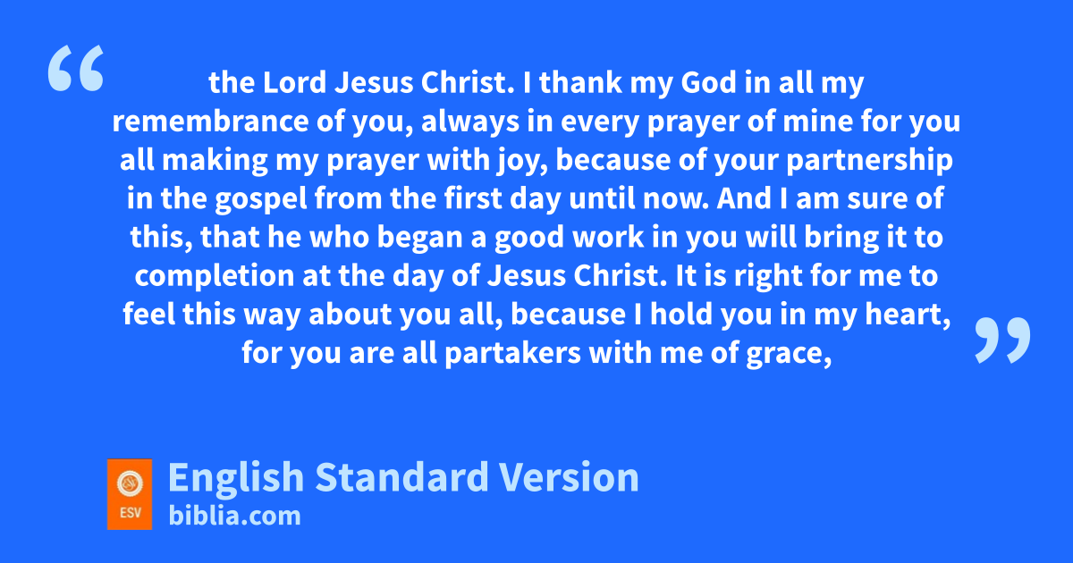 3 eI thank my God fin all my remembrance of you, 4 always in every prayer of mine for you all making my prayer with joy, 5 gbecause of your partnership in the gospel from the first day until now. 6 And I am sure of this, that he who began ha good work in you iwill bring it to completion at jthe day of Jesus Christ. 7 It is right for me to feel this way about you all, because I hold you kin my heart, for you are all lpartakers with me of grace,4 both min my imprisonment and in nthe defense and confirmation of the gospel. 8 For oGod is my witness, phow I yearn for you all with the affection of Christ Jesus. 9 And it is my prayer that qyour love may abound more and more, rwith knowledge and all discernment, 10 so that you may approve what is excellent, sand so be pure and blameless tfor the day of Christ, 11 filled uwith the fruit of righteousness that comes vthrough Jesus Christ, wto the glory and praise of God.