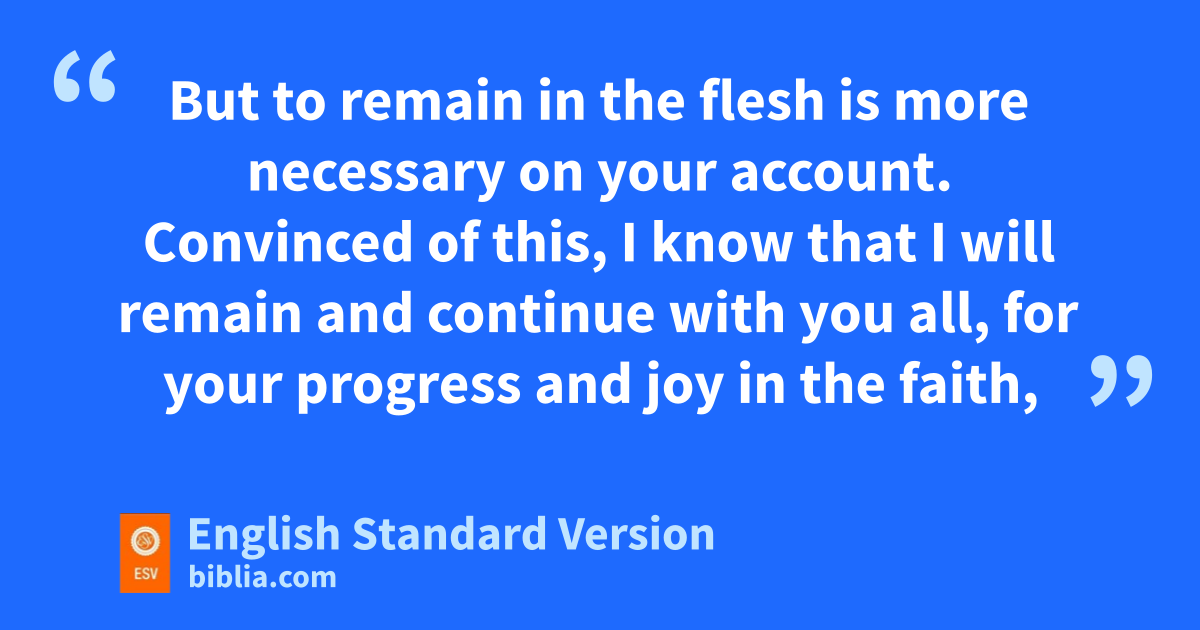 Yes, and I will rejoice, 19 for I know that fthrough your prayers and gthe help of hthe Spirit of Jesus Christ this will turn out for my deliverance, 20 as it is my eager expectation and hope ithat I will not be at all ashamed, but that with full jcourage now as always Christ kwill be honored in my body, lwhether by life or by death. 21 For to me mto live is Christ, and to die is gain. 22 If I am to live in the flesh, that means fruitful labor for me. Yet which I shall choose I cannot tell. 23 nI am hard pressed between the two. My desire is oto depart and pbe with Christ, for that is far better. 24 But to remain in the flesh is more necessary on your account. 25 qConvinced of this, rI know that I will remain and continue with you all, for your sprogress and tjoy in the faith, 26 so that in me uyou may have ample cause to glory in Christ Jesus, because of my coming to you again.