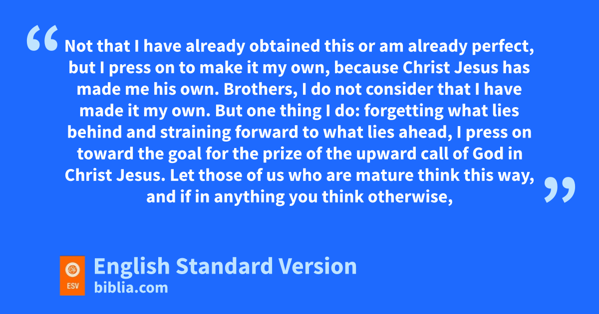12 Not that I have already lobtained this or mam already perfect, but I press on to make it my own, because Christ Jesus has made me his own. 13 Brothers, I do not consider that I have made it my own. But one thing I do: nforgetting what lies behind and straining forward to what lies ahead, 14 I press on toward the goal for othe prize of the upward pcall of God in Christ Jesus. 15 Let those of us who are qmature think this way, and if in anything ryou think otherwise, sGod will reveal that also to you. 16 Only tlet us hold true to what we have attained.