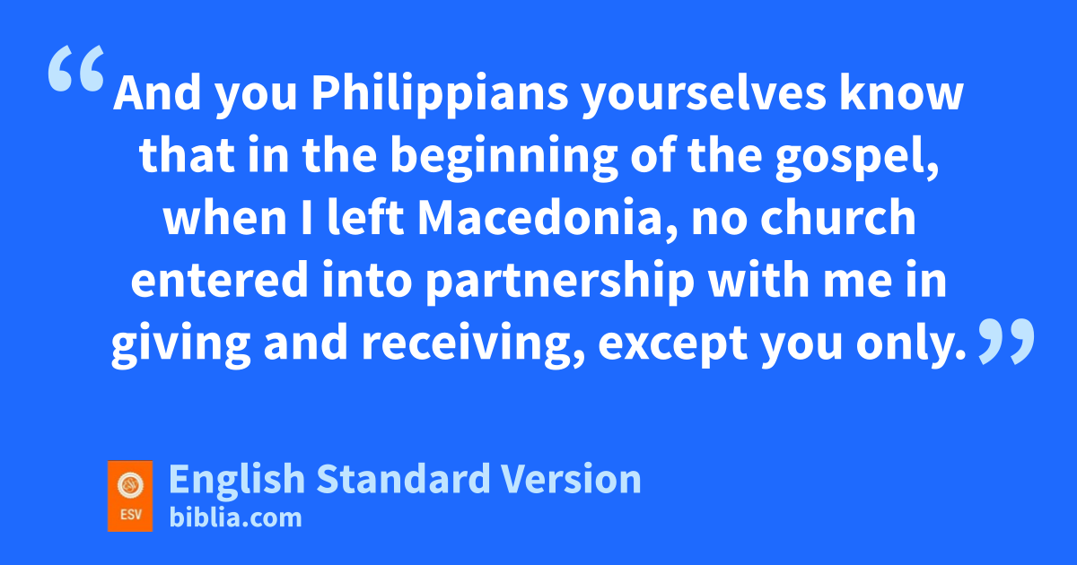 14 Yet it was kind of you eto share6 my trouble. 15 And you Philippians yourselves know that fin the beginning of the gospel, when I left Macedonia, gno church entered into partnership with me in giving and receiving, except you only. 16 Even in Thessalonica you sent me help for my needs once and again. 17 hNot that I seek the gift, but I seek ithe fruit that increases to your credit.7 18 I have received full payment, and more. I am well supplied, jhaving received from Epaphroditus the gifts you sent, ka fragrant offering, la sacrifice acceptable and pleasing to God. 19 And my God mwill supply every need of yours naccording to his riches in glory in Christ Jesus. 20 To oour God and Father be pglory forever and ever. Amen.