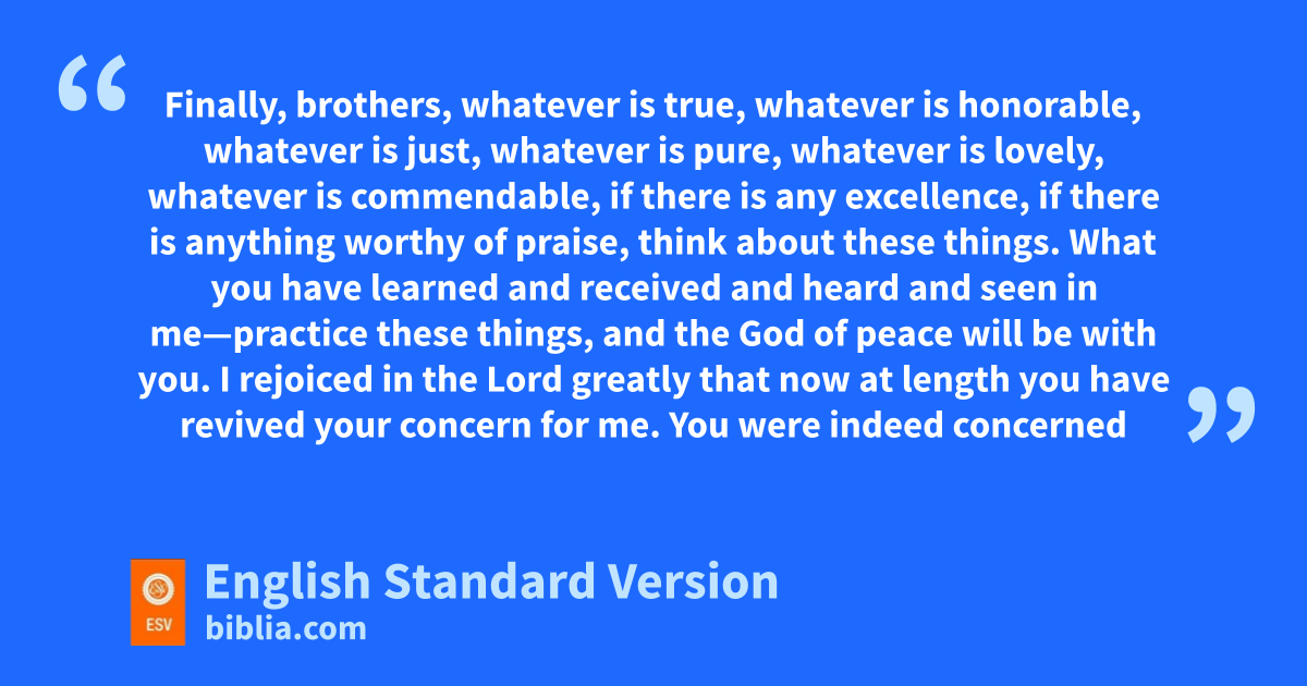 8 Finally, brothers, whatever is true, whatever is honorable, whatever is just, whatever is pure, whatever is lovely, whatever is commendable, if there is any excellence, if there is anything worthy of praise, think about these things. 9 What you have learned5 and wreceived and heard and seen xin me—practice these things, and ythe God of peace will be with you.