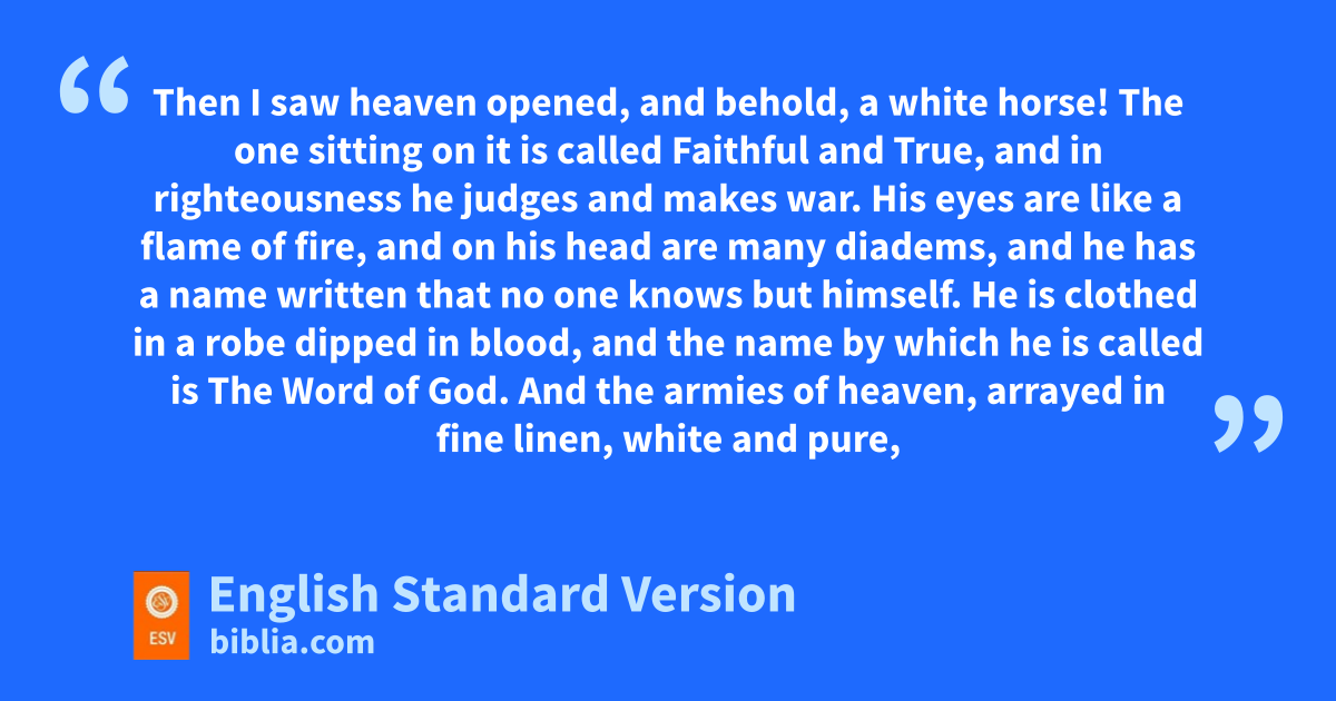 11 Then I saw jheaven opened, and behold, ka white horse! The one sitting on it is called lFaithful and True, and min righteousness he judges and makes war. 12 nHis eyes are like a flame of fire, and on his head are omany diadems, and he has pa name written that no one knows but himself. 13 He is clothed in qa robe dipped in4 blood, and the name by which he is called is rThe Word of God. 14 And the armies of heaven, sarrayed in fine linen, white and pure, twere following him on white horses. 15 uFrom his mouth comes a sharp sword vwith which to strike down the nations, and whe will rule3 them with a rod of iron. xHe will tread the winepress of the fury of the wrath of God the Almighty. 16 On his robe and on his thigh yhe has a name written, zKing of kings and Lord of lords.