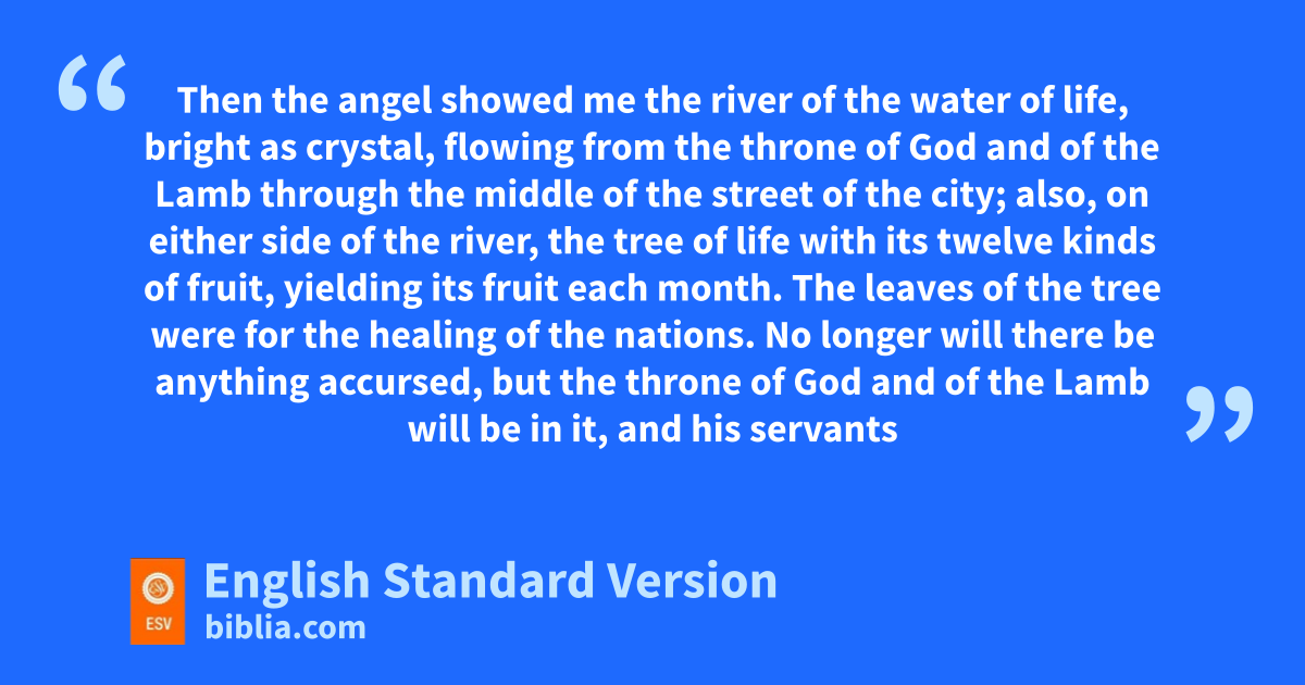22 Then the angel1 showed me xthe river of ythe water of life, bright as crystal, flowing from the throne of God and of the Lamb 2 through the middle of zthe street of the city; aalso, on either side of the river, bthe tree of life2 with its twelve kinds of fruit, yielding its fruit each month. The leaves of the tree were cfor the healing of the nations. 3 dNo longer will there be anything accursed, but ethe throne of God and of the Lamb will be in it, and fhis servants will worship him. 4 gThey will see his face, and hhis name will be on their foreheads. 5 And inight will be no more. They will need no light of lamp jor sun, for kthe Lord God will be their light, and lthey will reign forever and ever.